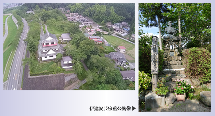 写真右が涌谷城(涌谷町立史料館)、左は二の丸跡太鼓堂です。