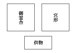 神棚と御霊舎を同じ場所におまつりする場合は、宮形と御霊舎の座位を考えて、下図のように宮形と御霊舎を並べてすえます。