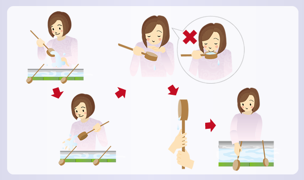 手水(てみず)をとる作法1.右手で柄杓を持ち、水を汲んで左手にかけ左手を清めます。2.次に柄杓を左手に持ち替えて、同じように右手を清めます。 3.再び柄杓を右手に持ち、左の手のひらに水を受けて口をすすぎます。 4.口をすすぎ終えたら、もう一度水を左手に流します。 5.最後に水の入った柄杓を立て、柄に水を流してから伏せて置きます。 |